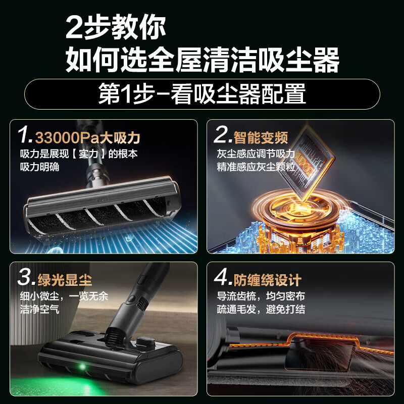 3、这个吸尘器的性能超级棒的耶,吸力强大不说,吸一遍就吸干净了,还有那绿色的小灯儿走到哪照到哪里,让灰尘无处遁形,非常的方便,吸完一看也没有毛发缠绕到·滚刷上,非常的实用