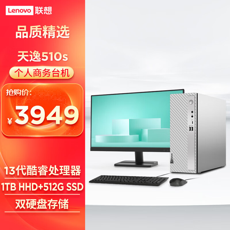 联想(Lenovo)天逸510S 个人商务台式机电脑主机(13代i5-13400? 16G 1TB HDD+512G SSD wifi win11 )21.45英寸价格:3949.00元!