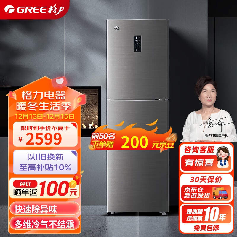 格力(GREE)晶弘 227升三开门冰箱一级能效风冷无霜 长效净味低噪家用租房小型三门冰箱中门变温 BCD-227WPTCL价格:2599.00元!