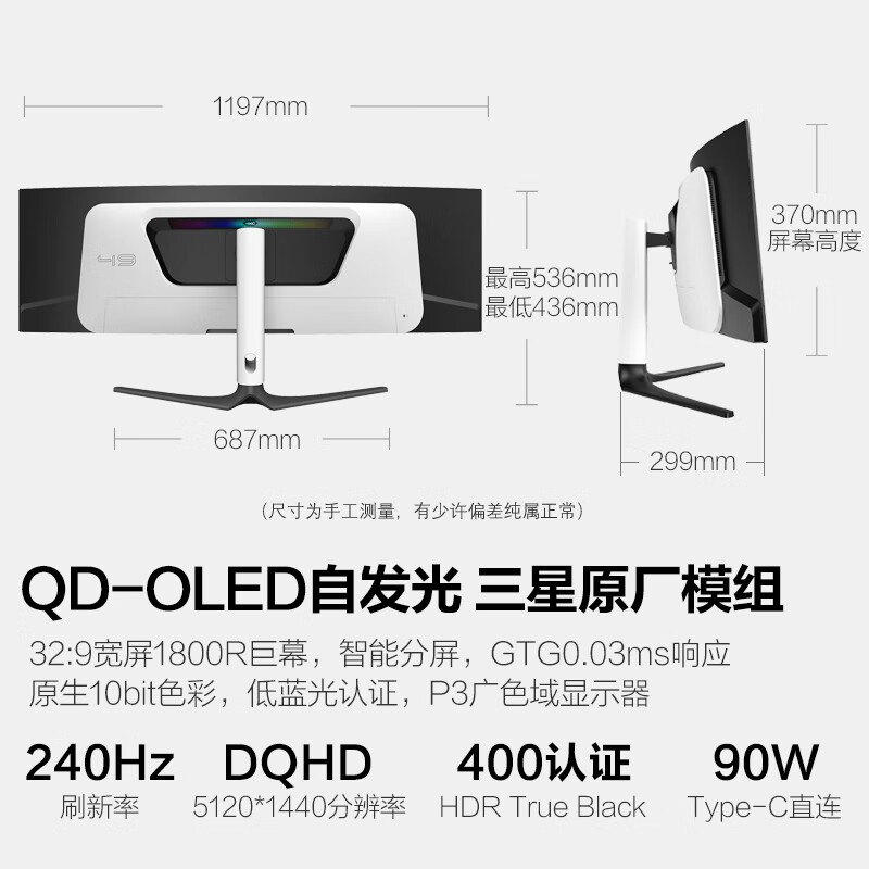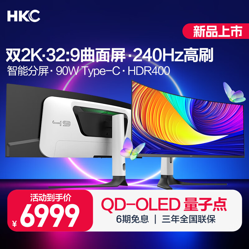 HKC 49英寸OLED曲面5K超清240Hz超宽带鱼屏0.03ms硬件低蓝光HDR400原生10Bit旋转升降显示器GS49UK价格:7999.00元!