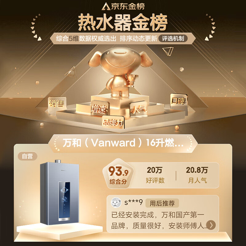 3、物流很快,安装也很及时,电器类基本都在京东购买。选了很久的燃气热水器,还是选中这款万和16升水量伺服,低噪智能防冻,加热迅速,恒温稳定。相信万和品质。