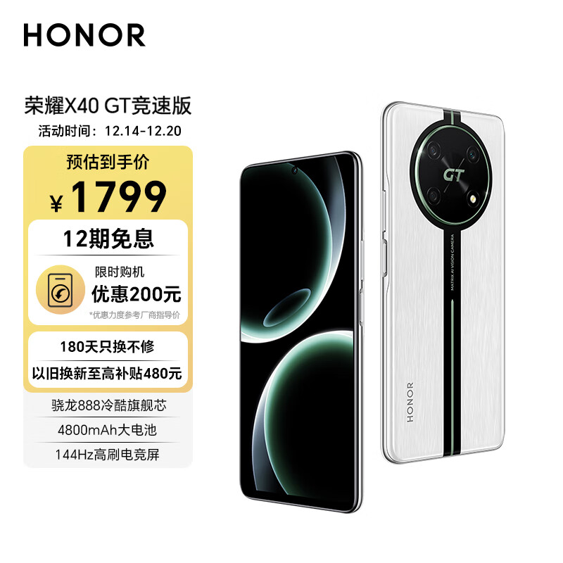 荣耀X40 GT竞速版 骁龙888冷酷旗舰芯 满血66W快充 超大内存 5G手机 12GB+512GB 竞速银价格:1999.00元!