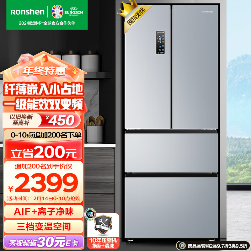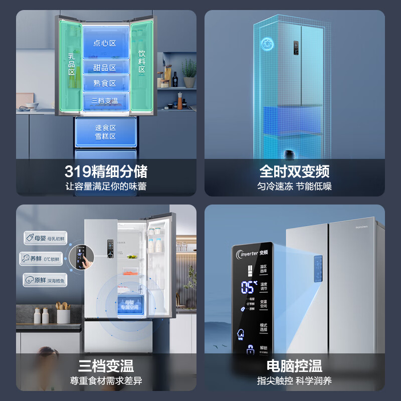 容声(Ronshen)319升变频一级能效法式多门四开门冰箱家用风冷无霜超薄大容量BCD-319WD11MP三档调温价格:2599.00元!