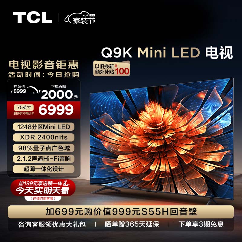 TCL电视 75Q9K 75英寸 Mini LED 1248分区 XDR 2400nits QLED量子点 超薄 游戏电视机 北京以旧换新价格:6999.00元!