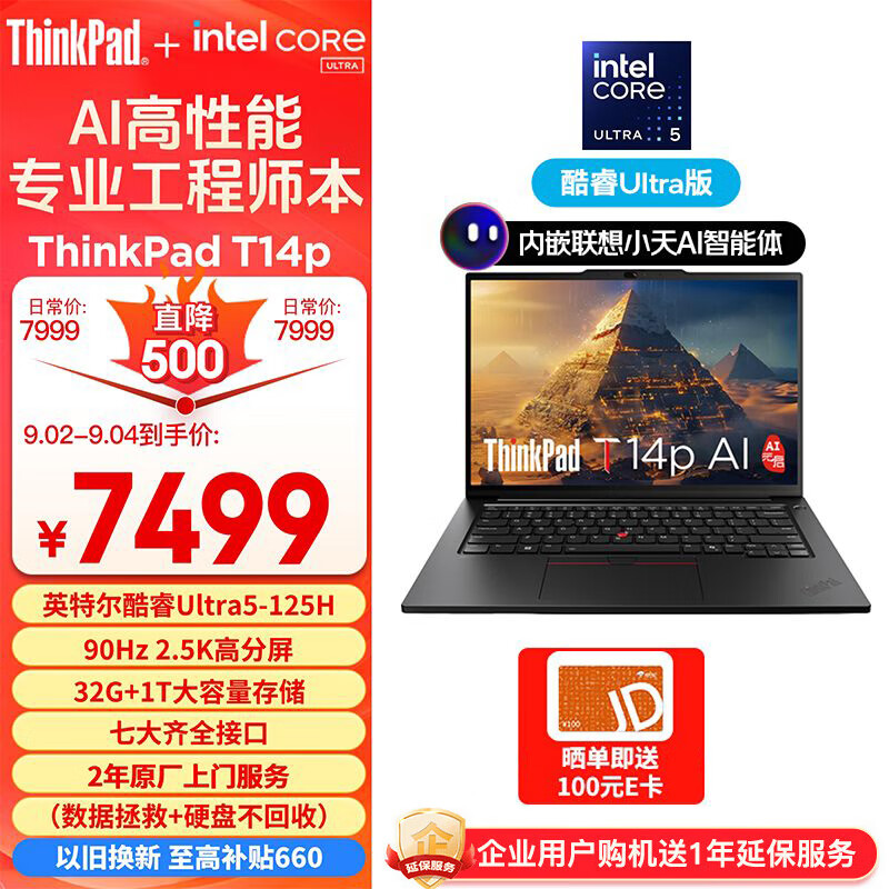 ThinkPad T14p AI PC 酷睿Ultra5 125H标压 14.5英寸高性能工程师本笔记本电脑 32G 1TB 2.5K 商务办公本价格:7499.00元!
