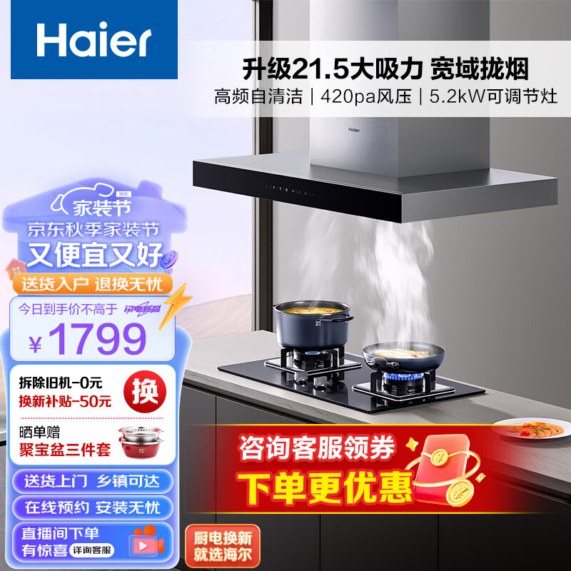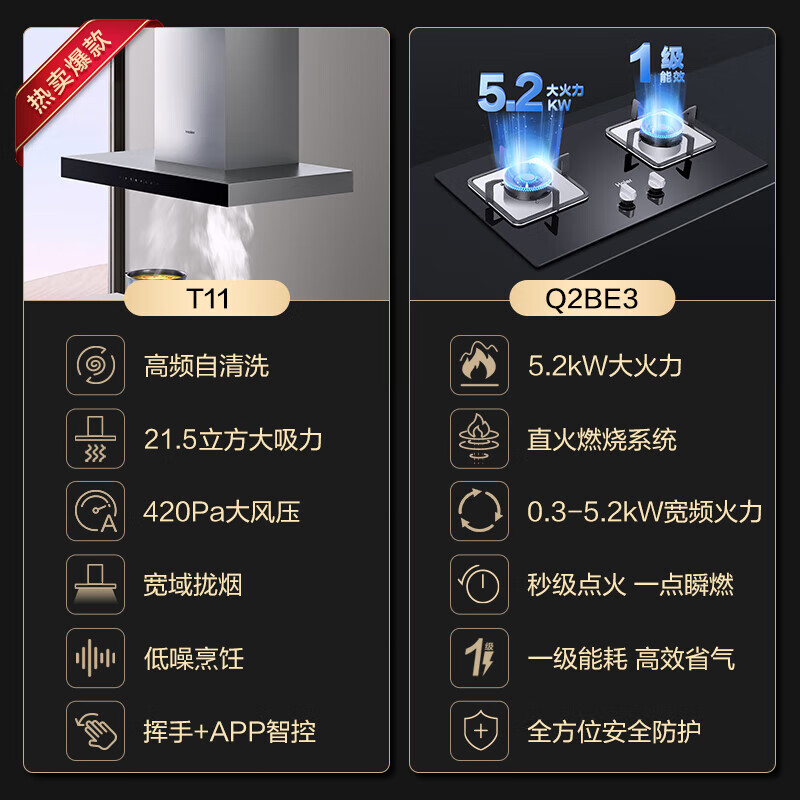 海尔(Haier)抽油烟机 顶吸欧式烟灶套装 升级21.5m3/min大吸力 挥手智控自清洁 油烟机灶具套装T11+Q2BE3(天)价格:1899.00元!