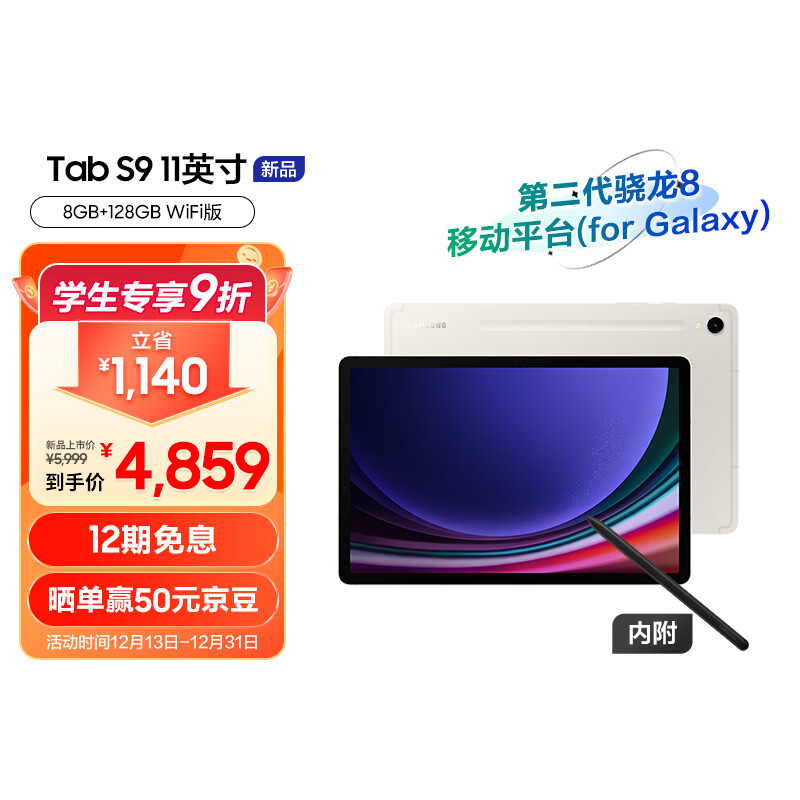 三星平板电脑2023款Tab S9 11英寸 8G+128GB【学生专享版】WIFI 骁龙8Gen2 顺滑全视屏 内附Spen 云雾金价格:5399.00元!