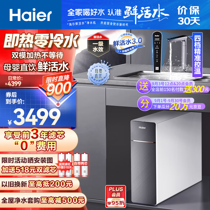 海尔(Haier)【鲜活水系列】净热一体鲜腾净水器加热直饮一体机家用即热零冷水厨下式RO反渗透过滤器直饮机1560价格:3599.00元!