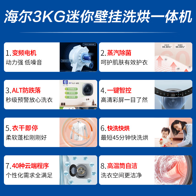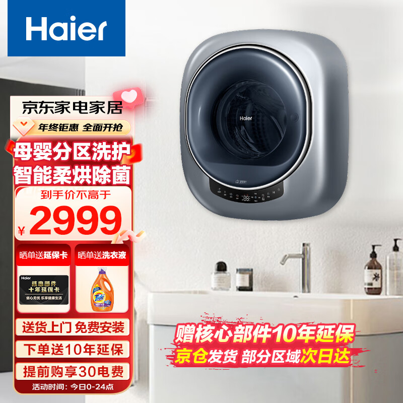海尔(Haier)3KG壁挂迷你滚筒洗衣机全自动母婴幼儿内衣分区洗变频高温除菌物联+洗烘一体XQGM30-HB711U1[家电]价格:2999.00元!