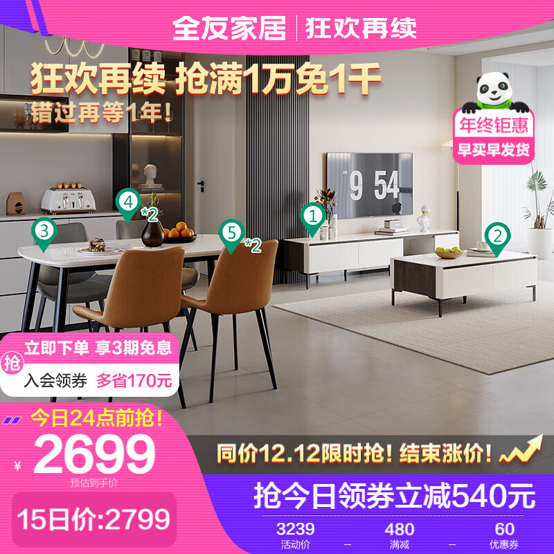 全友家居 时尚拼色客餐厅7件套装DW1181茶几电视柜一桌四椅组合家具价格:3239.00元!