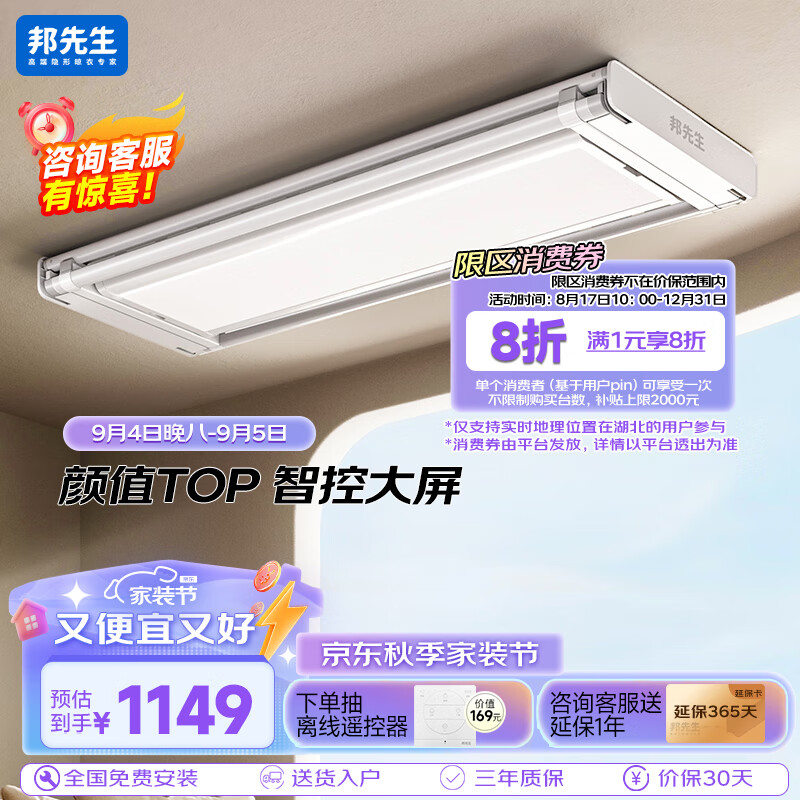 邦先生超薄隐形嵌入式电动晾衣架全自动智能升降阳台伸缩凉晒衣机M22A白价格:1699.00元!