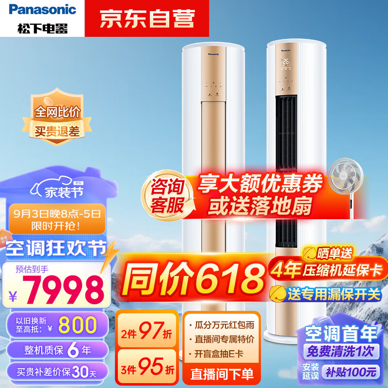 松下空调 净悦星3匹新三级能效 圆柱立式柜机客厅空调变频 纳诺怡除菌洁净 WiFi 以旧换新 ZY72F330N价格:7998.00元!