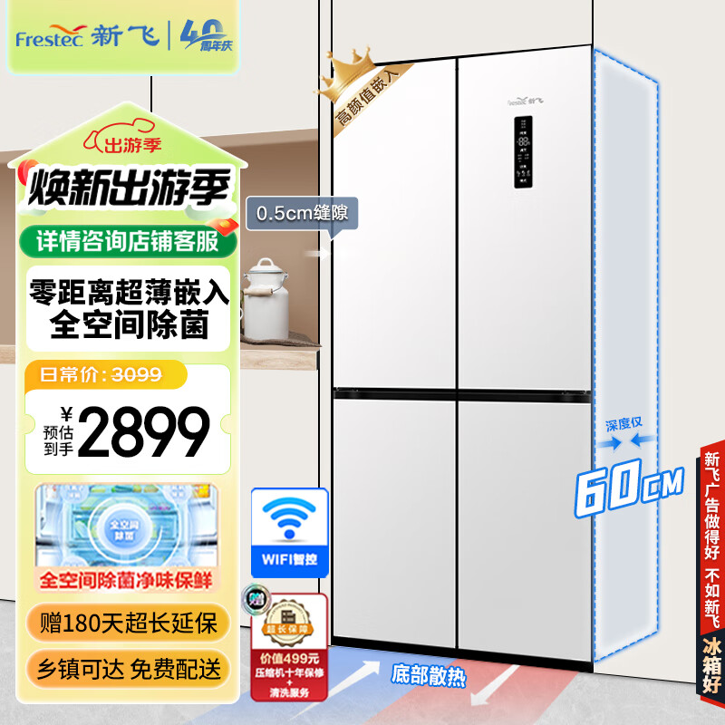 新飞60cm超薄嵌入445L十字对开门冰箱一级双直流变频底部散热全空间除菌无霜以旧换新BCD-445WKQ8AT白价格:2899.00元!