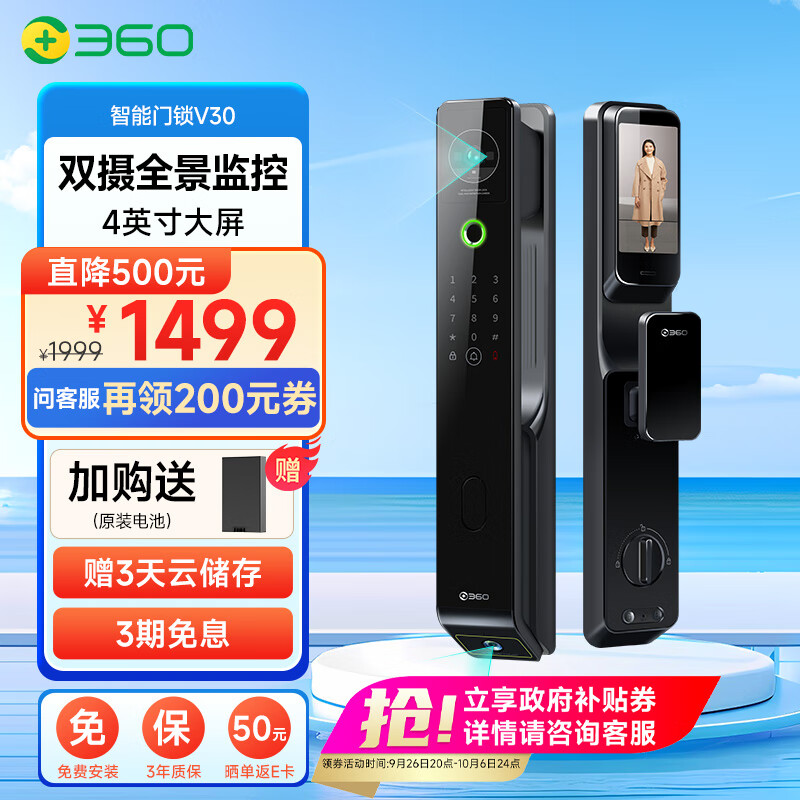 360智能门锁V30指纹锁密码锁家用智能锁电子锁入户门自动门锁双摄像头大屏防盗锁可视猫眼远程解锁价格:1499.00元!
