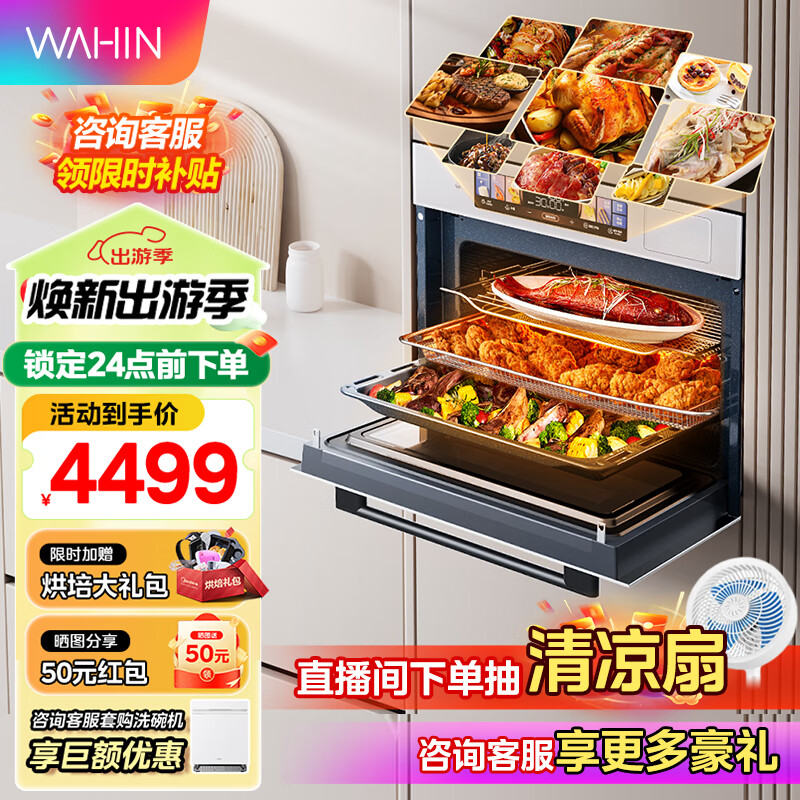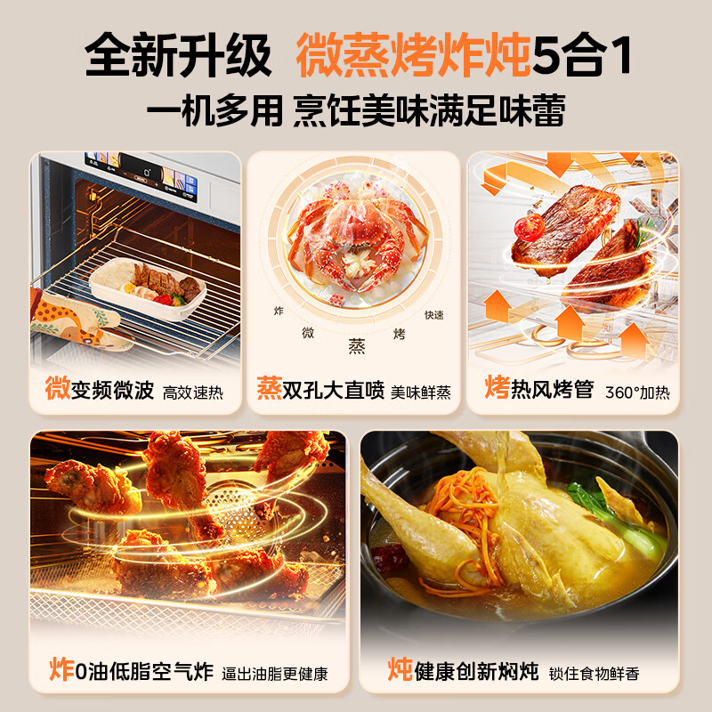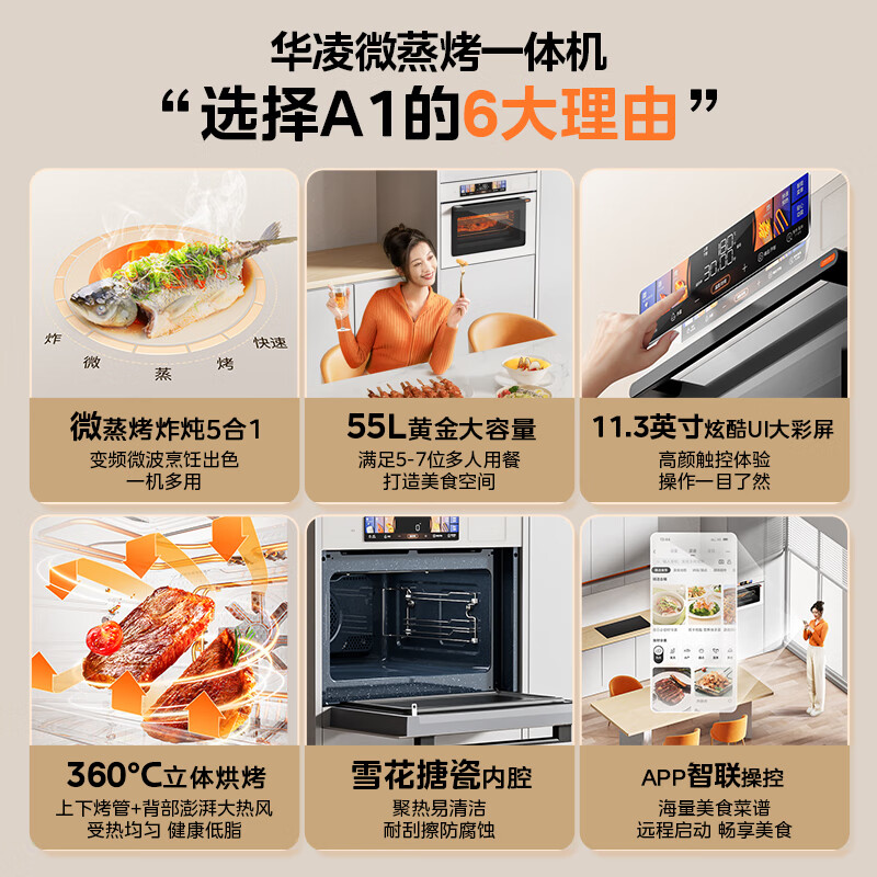 华凌微蒸烤一体机嵌入式蒸烤箱A1 微蒸烤炸炖5合1 55L家用立体热风脱脂UI彩屏智控搪瓷内胆小泡芙A1价格:4499.00元!