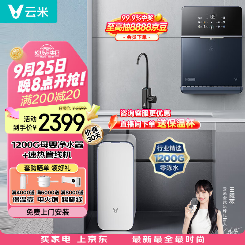 云米(VIOMI)Super Y 1200G全屋净水套装净水器+管线机Master 2S两件套家用直饮加热即热净水器净水机价格:2599.00元!