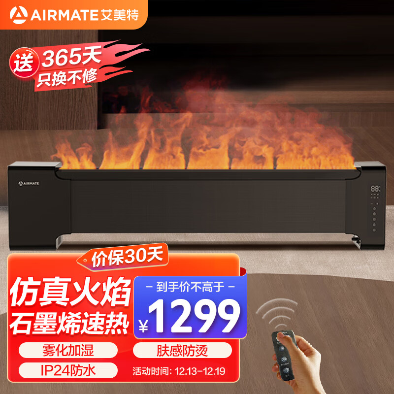 艾美特(AIRMATE)【仿真火焰】石墨烯踢脚线取暖器暖风机家用电暖器电暖气片 浴室防水防烫加湿烤火炉移动地暖 AIR6价格:1699.00元!