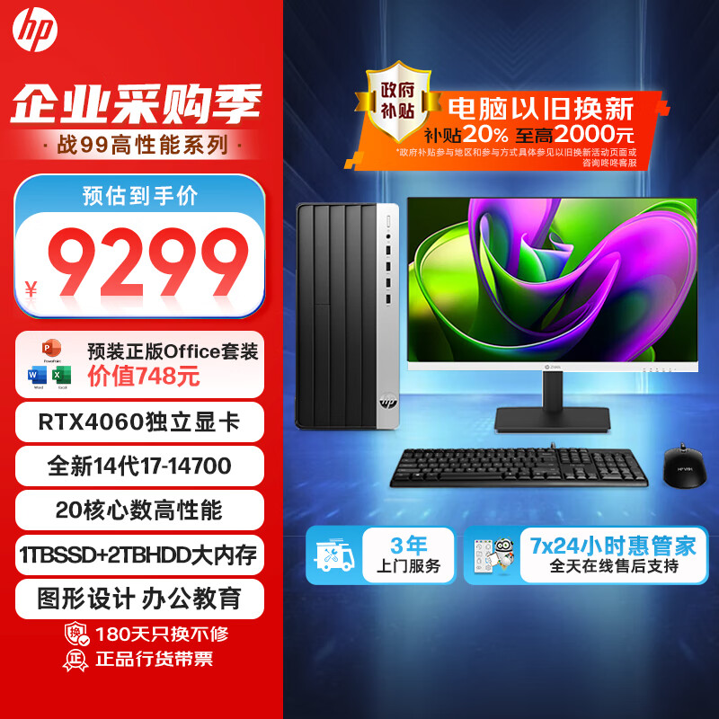 惠普 战99 游戏台式电脑主机(14代i7-14700 32G 1T+2T RTX4060) Ai大模型 畅玩黑神话 27英寸2K价格:9299.00元!