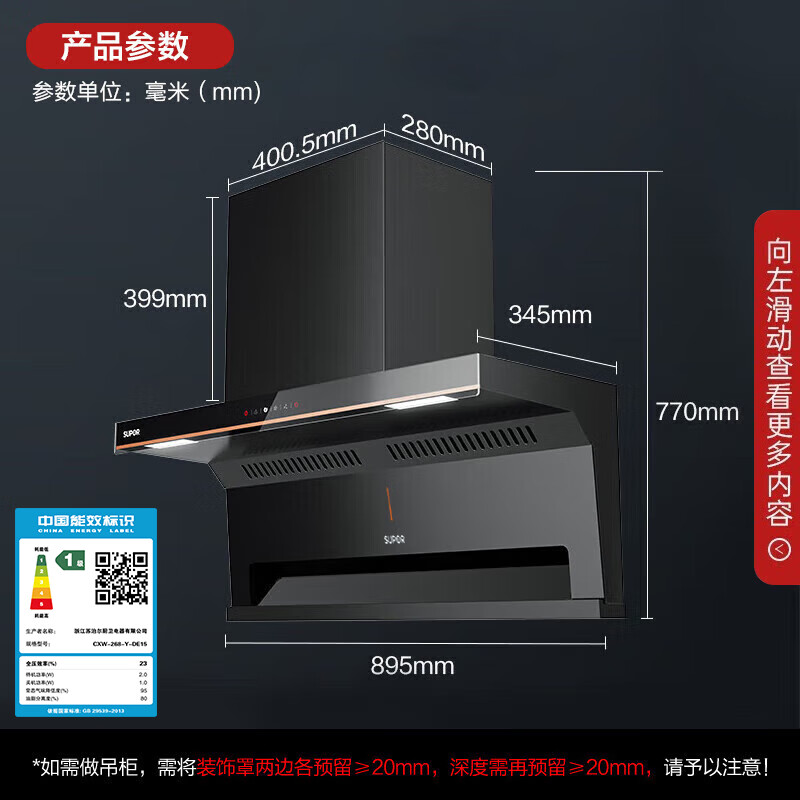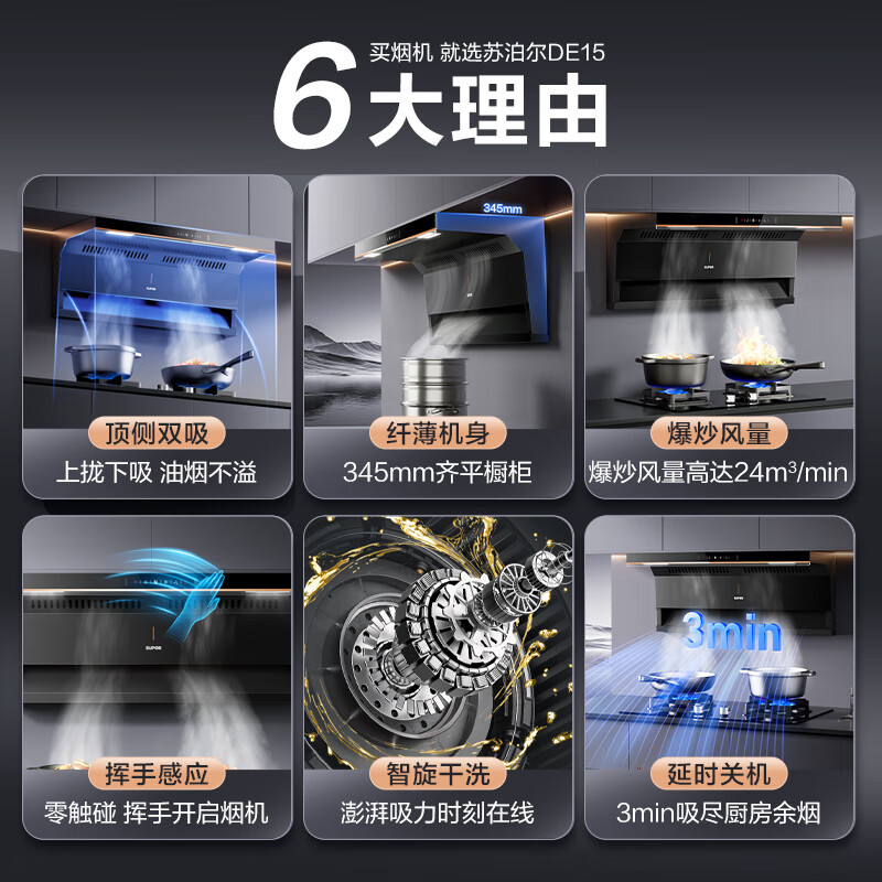 苏泊尔(SUPOR) 抽油烟机顶侧双吸油烟机7字型 24立方挥手感应免拆洗家用厨房吸油烟机 DE15单烟机价格:1498.00元!