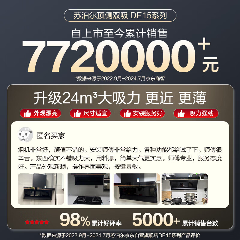 4、排烟效果:排烟效果:比之前家里用的好太多了,效果杠杠的外形外观:简约高大上看着很舒服静音效果:效果不错声音可以接受清洗难度:一键自动清洗很方便噪音程度:基本上没有噪音总体来说抽油烟机和煤气灶使用着还不错,后续会继续关注苏珀尔这个品牌,家里好多电器都是苏珀尔这个品牌的。