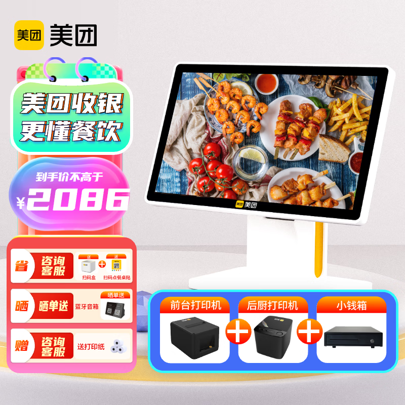 美团单屏收银机 餐饮店扫码支付 扫码点餐 收银系统(主机+58打印+80打印+钱箱)单屏套餐五价格:2086.00元!