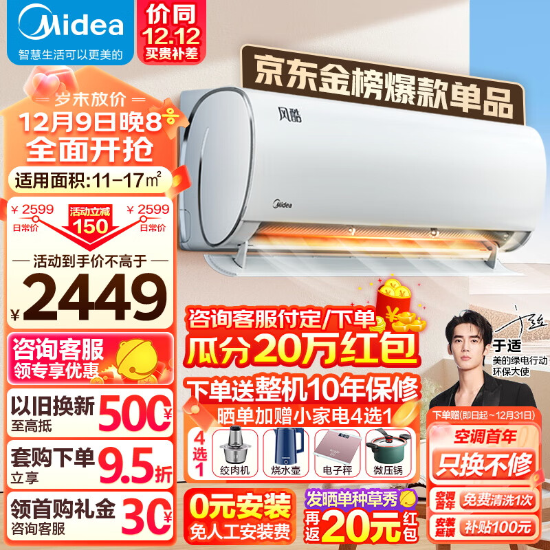美的(Midea)风酷 大1匹 新一级能效变频冷暖 大风量 自清洁 智能家电 家用壁挂式空调挂机 KFR-26GW/N8XHC1价格:2449.00元!