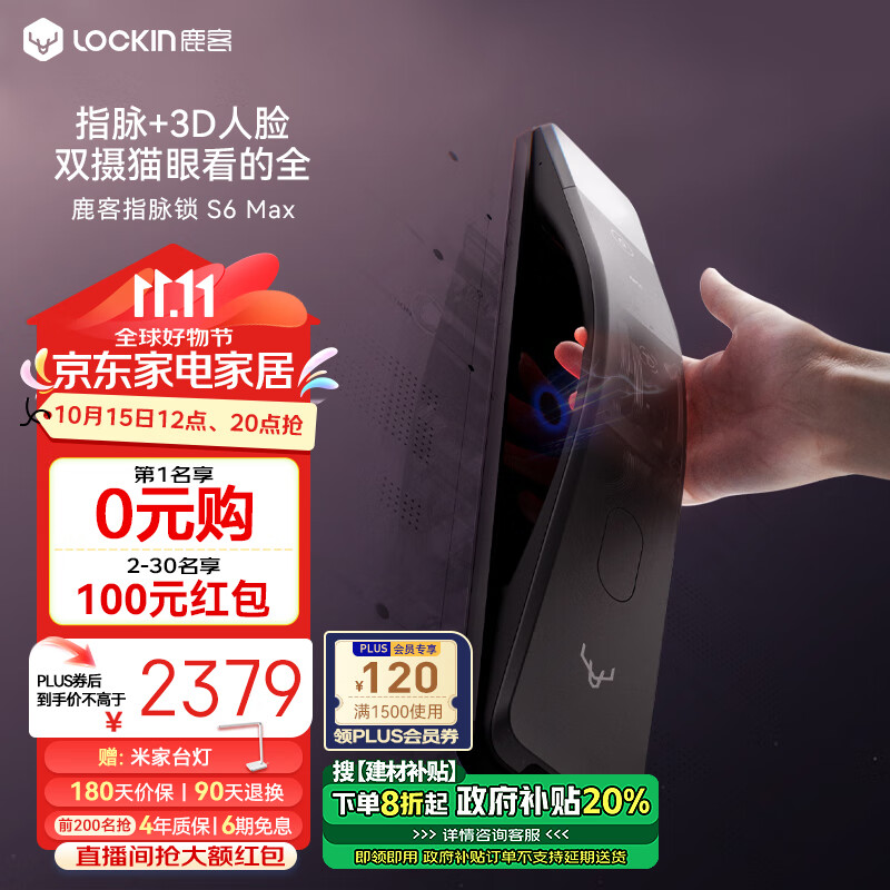 鹿客(lockin)S6 Max指脉锁人脸识别双摄4.7英寸猫眼屏电子锁智能门锁价格:2499.00元!