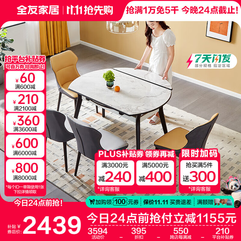 全友家居 餐桌椅组合轻奢风方圆两用岩板餐桌可伸缩家用饭桌子DW1059价格:3594.38元!