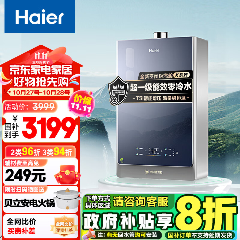 1、#海尔燃气热水器#海尔K系列,双循环零冷水、关水再开没有冷烫水、安装材料费及人工费全免。零冷水幸福感真的很强,再也不用瑟瑟发抖等热水洗澡了。热水器颜值很高!