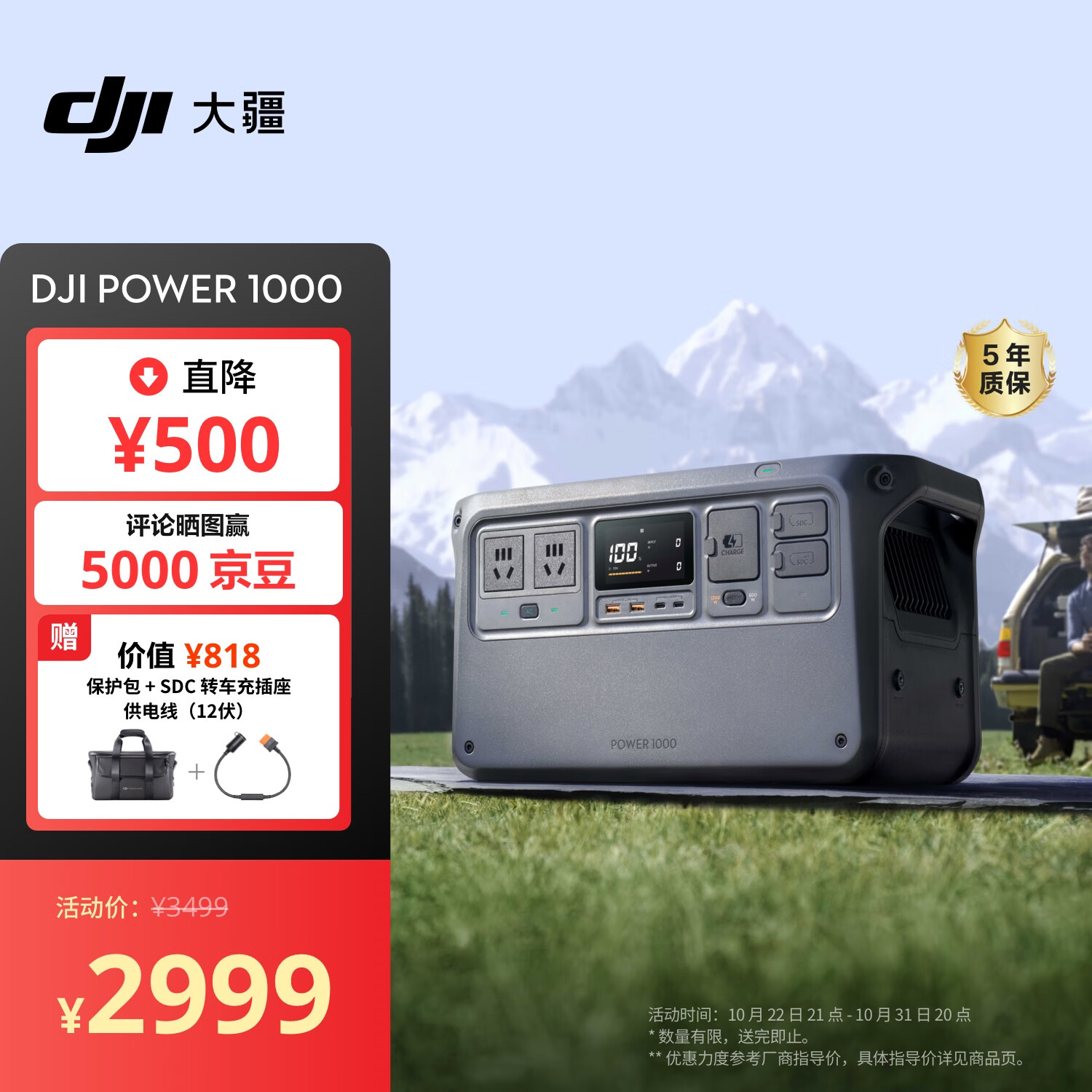 大疆【2600W真大功率】户外移动电源 1度电 220V大容量 露营户外车载摆摊备用储能电源 DJI Power 1000价格:2999.00元!