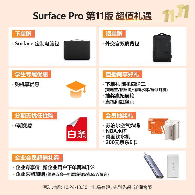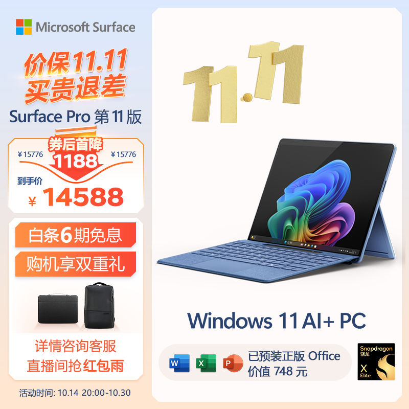 微软(Microsoft)Surface Pro第11版 二合一平板电脑笔记本AIPC Pro11骁龙X Elite 16G+1T宝石蓝【键盘触控笔套装】价格:14988.00元!