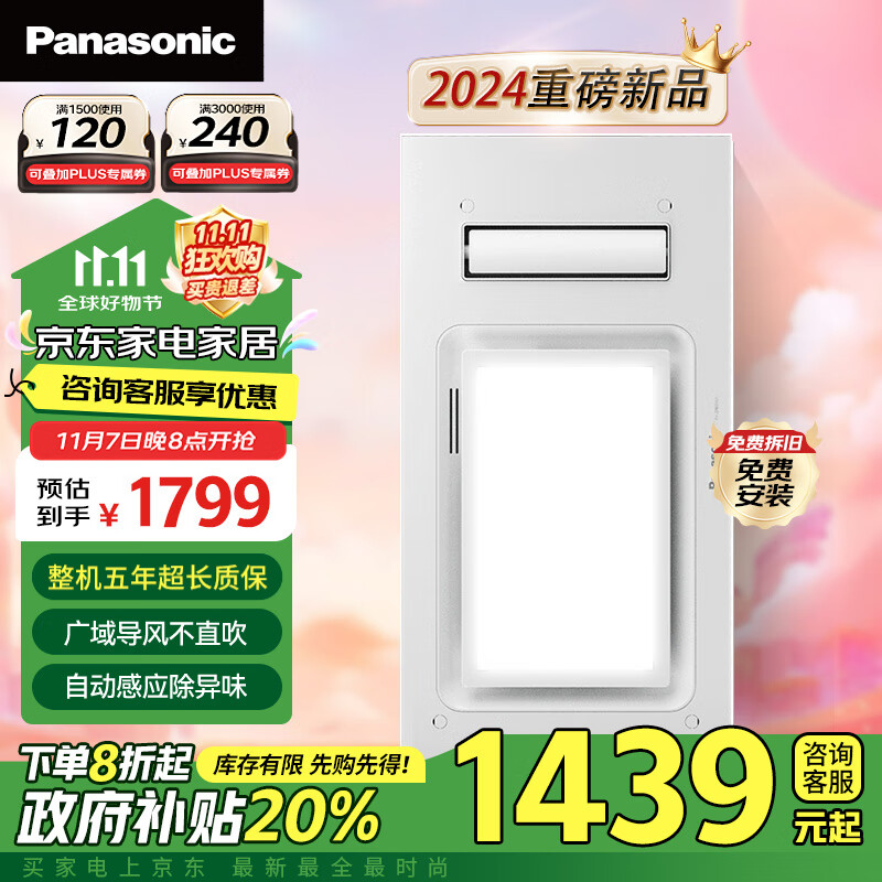 松下(Panasonic)风暖浴霸照明排气一体集成300x600灯除异味浴室暖风机FV-JDBQVU1价格:1799.00元!