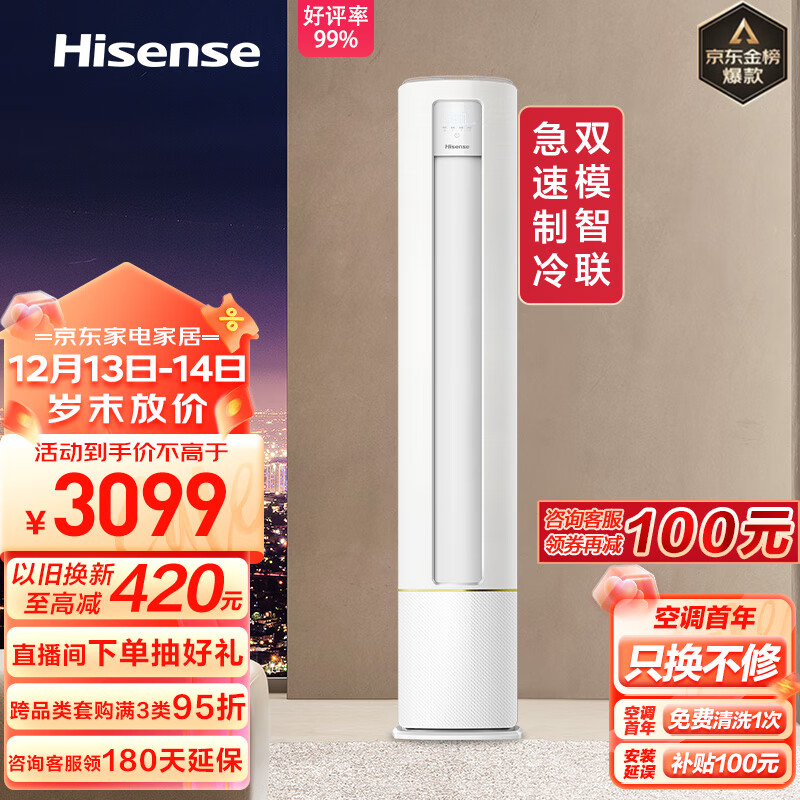 海信(Hisense)2匹 速冷热 三级能效 急速冷暖手机智控 变频冷暖自清洁两匹客厅空调立式柜机KFR-50LW/A190-X3价格:3099.00元!