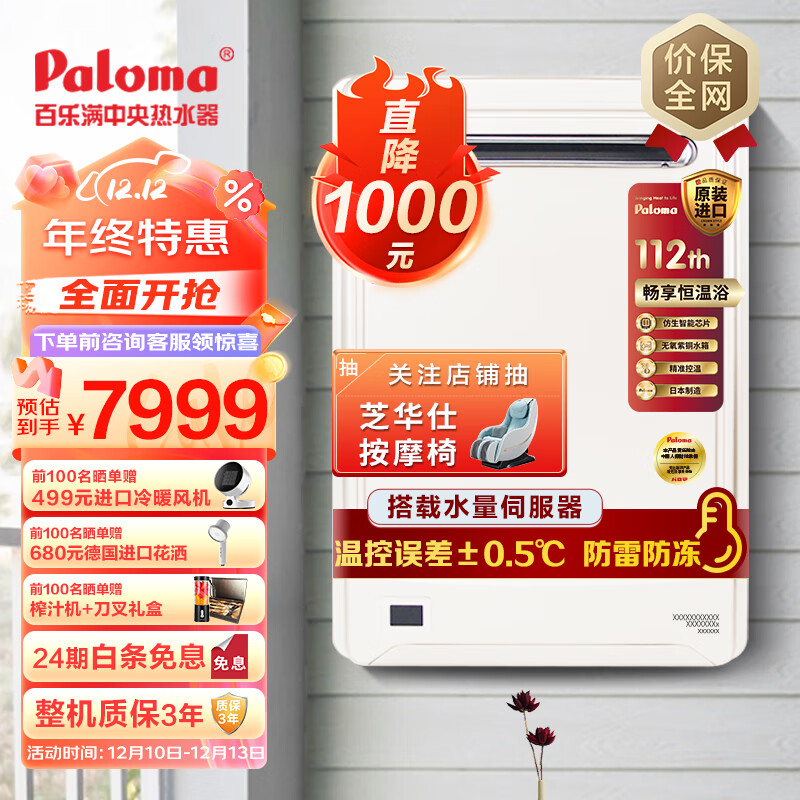 百乐满(Paloma)燃气热水器 24升 日本原装进口 室外安装 家用 (JSW48-EC-24K) 天然气价格:8999.00元!