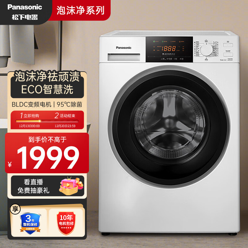 松下(Panasonic)滚筒洗衣机白色全自动8kg 变频电机节能省电 泡沫净强劲去污 筒清洁 6项智控 XQG80-3GQE2价格:2199.00元!