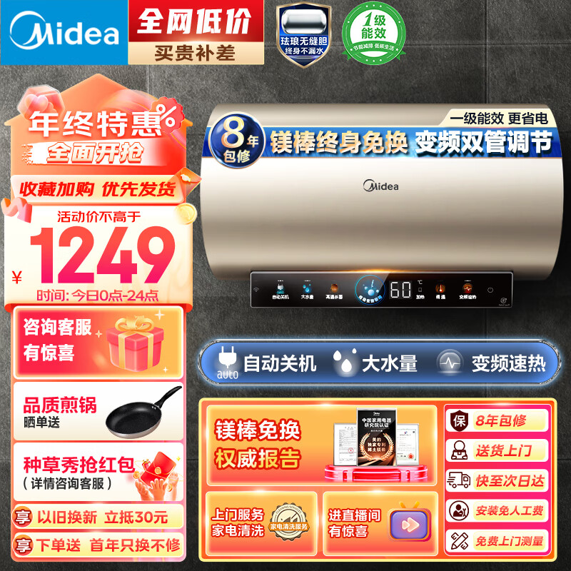 美的(Midea)终身免换镁棒60升电热水器家用储水式3300W/2300W速热变频省电一级能效低耗节能F6033-JE6(HE)价格:1449.00元!