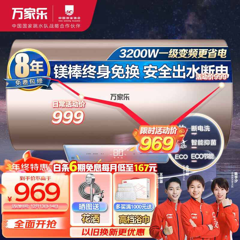 万家乐电热水器80升 储水式一级能效3200W速热 镁棒免换 出水自动断电手机智控D80-FW3价格:968.00元!