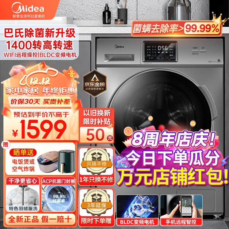 美的(Midea) 滚筒全自动变频家用洗衣机10公斤 巴氏除菌智能操控 高温桶自洁除螨 以旧换新 MG100S31DG5-Y1YW价格:1569.00元!