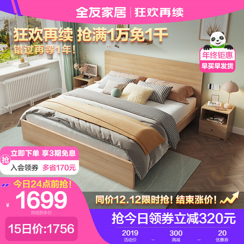 全友家居 床北欧原木色1.8米双人床 主卧室家具框架床价格:2019.00元!