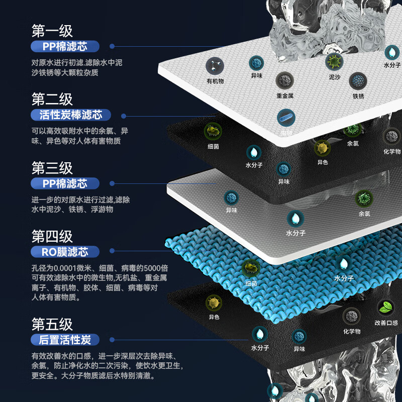 滤芯:活性炭,PP棉,RO反渗透膜