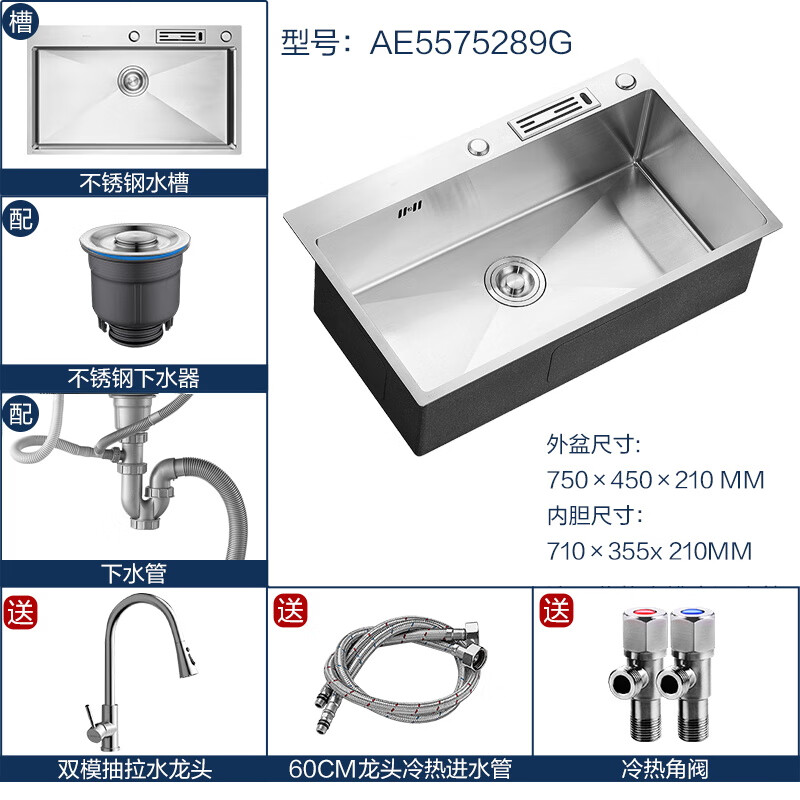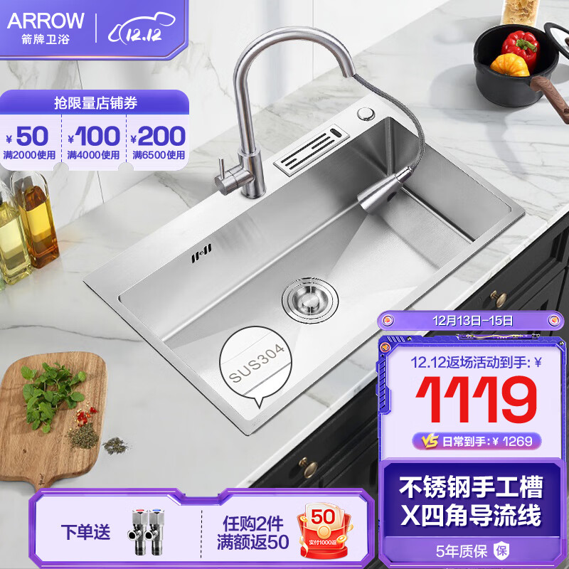 箭牌(ARROW) 304不锈钢加厚手工水槽单槽厨房橱柜水池洗碗盆洗菜盆台上台下 75*45手工槽(含抽拉龙头)价格:1509.00元!