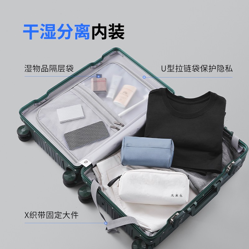 5、颜色非常好看质感很棒不是那种便宜的地摊货干湿分离的很方便看起来比一般的20英寸行李箱要能装一点双十一活动非常划算很好