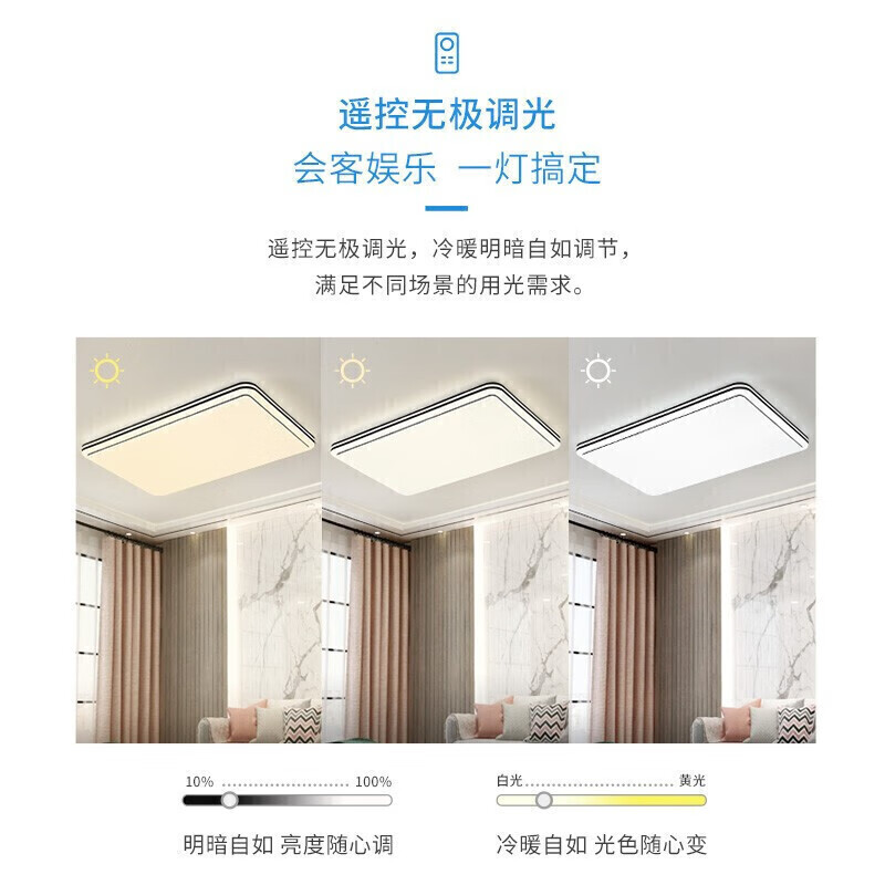 此款雷士吸顶灯挺好的,家里用的都是雷士照明,价格便宜,质检过关,时尚,外观款式:外环与我的装修风格完全相符,适合我这个大客厅灯光效果:效果和我想的一样,不刺眼,亮度高。操作控制:遥控操作很方便材质工艺:塑料吧