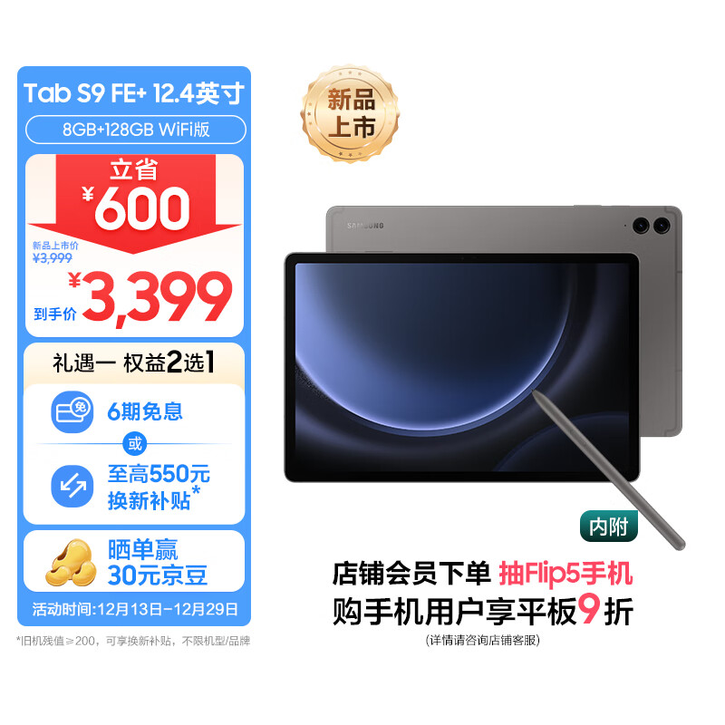 三星平板电脑2023款Tab S9 FE+ 12.4英寸 8+128GBWIFI版护眼高清高亮度大屏IP68防水Spen学生网课办公石墨灰价格:3399.00元!