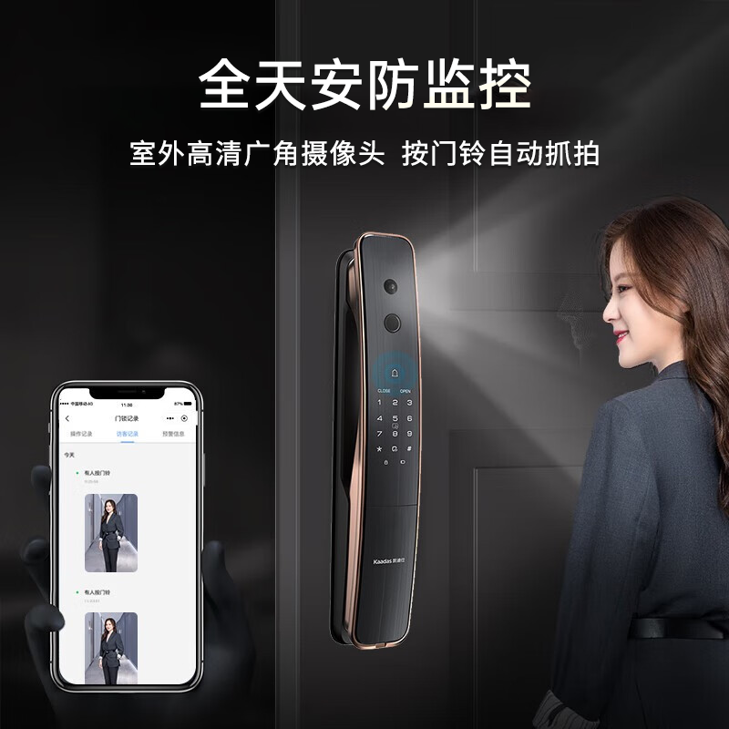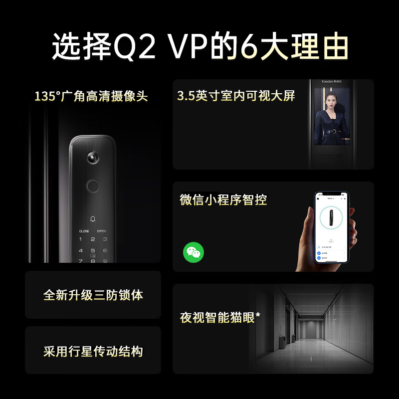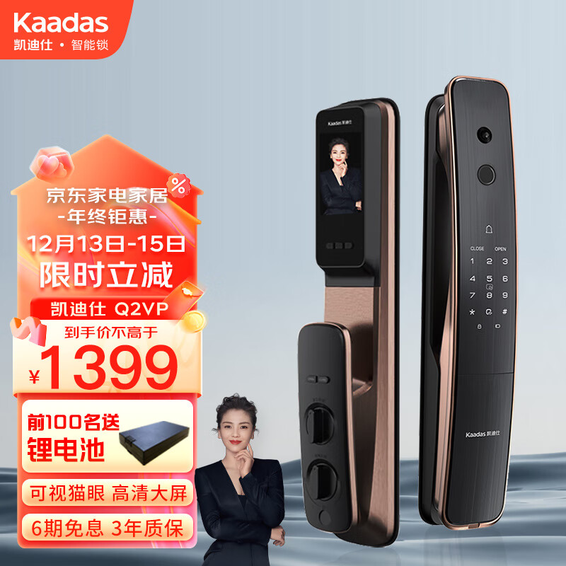 凯迪仕(KAADAS)Q2VP智能锁指纹锁全自动防盗门电子锁室内猫眼可视智能门锁密码锁 Q2VP红古铜【大屏猫眼可视】价格:1599.00元!