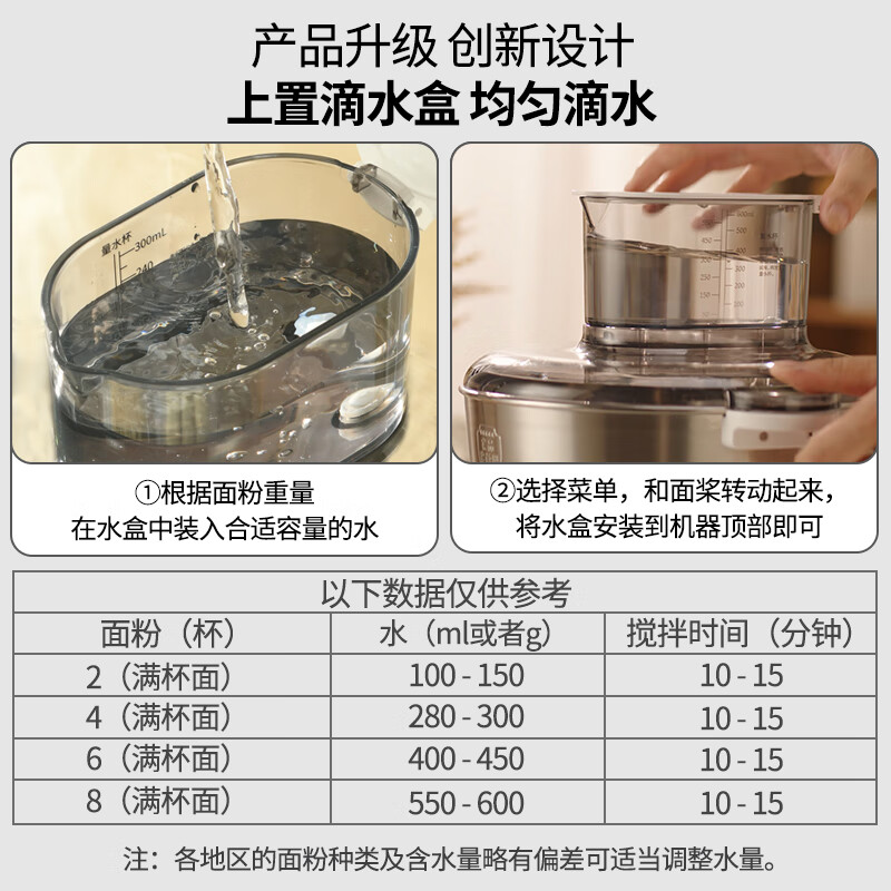 3、和面超级快,可随时添加水,一次全家够吃,声音很小,转速很高,带有恒温醒面功能,非常方便实用。