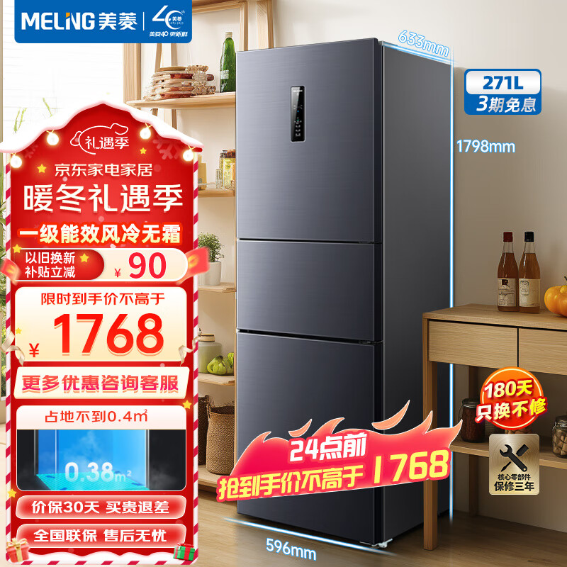 美菱(MeiLing)【离子净】271升三门小冰箱超薄嵌入一级能效变频小型家用大冷冻风冷无霜宿舍租房不串味迷你冰箱 浅灰色 荣耀灰价格:1868.00元!