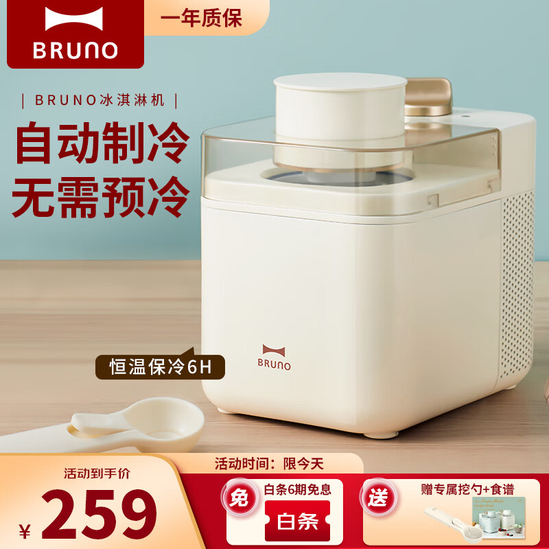 BRUNO 冰淇淋机家用全自动冰激淋机无需预冷2小时DIY自动制作水果儿童雪糕机附带精美挖勺 香草白价格:259.00元!