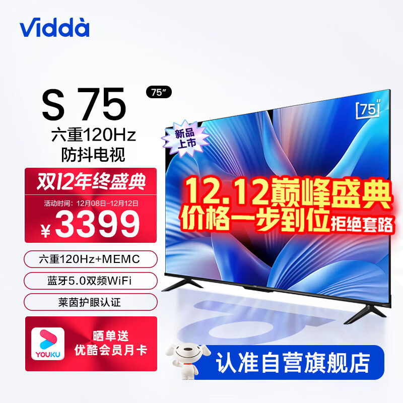 Vidda海信出品 S75 75英寸120Hz高刷新4K超薄屏远场语音2+32G智能液晶电视 75V1K-M[厂家直送]价格:3399.00元!
