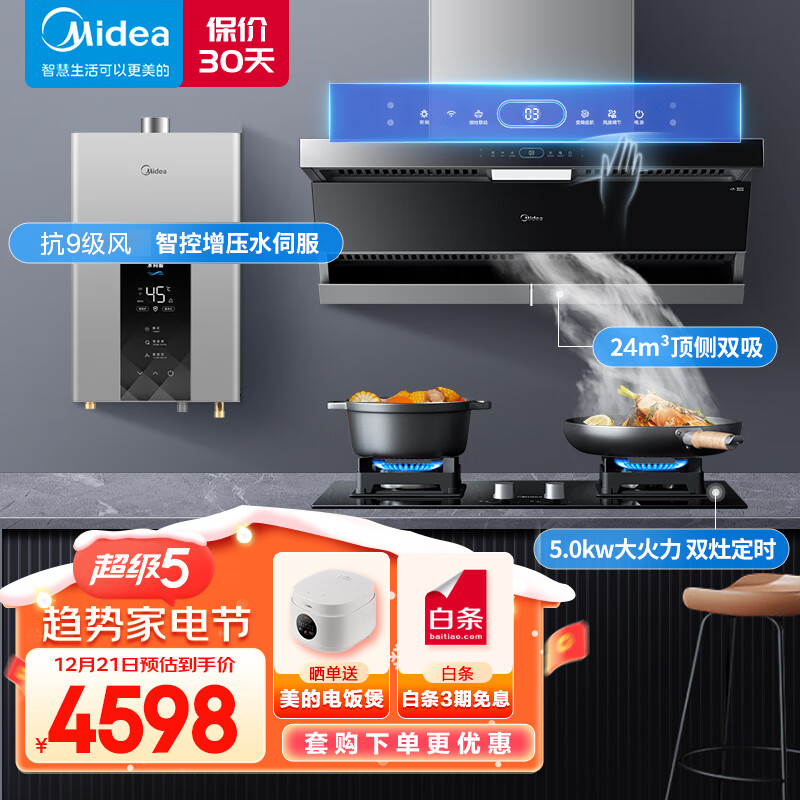 美的(Midea)抽油烟机燃气灶具顶侧双吸烟灶联动变频大吸力恒温热水器厨房三件套DL5+Q523L+JSQ30-MK6天然气价格:4598.00元!
